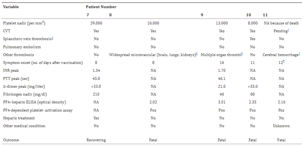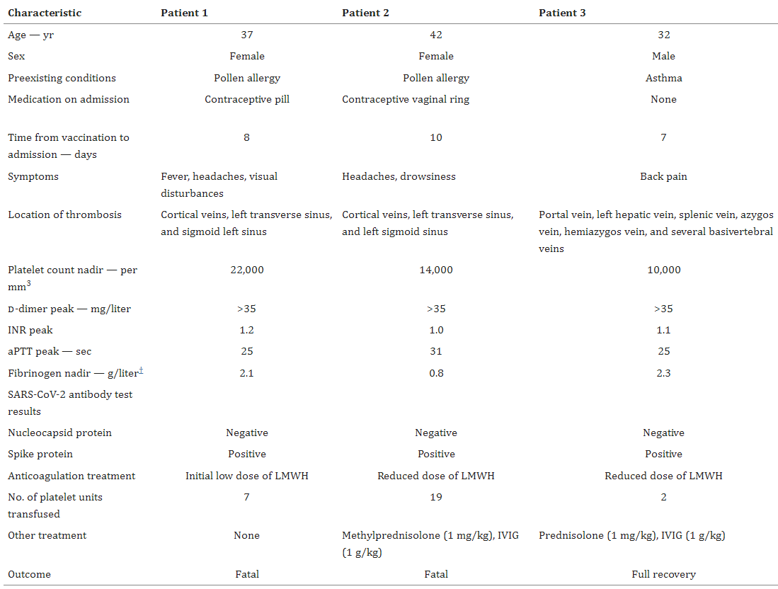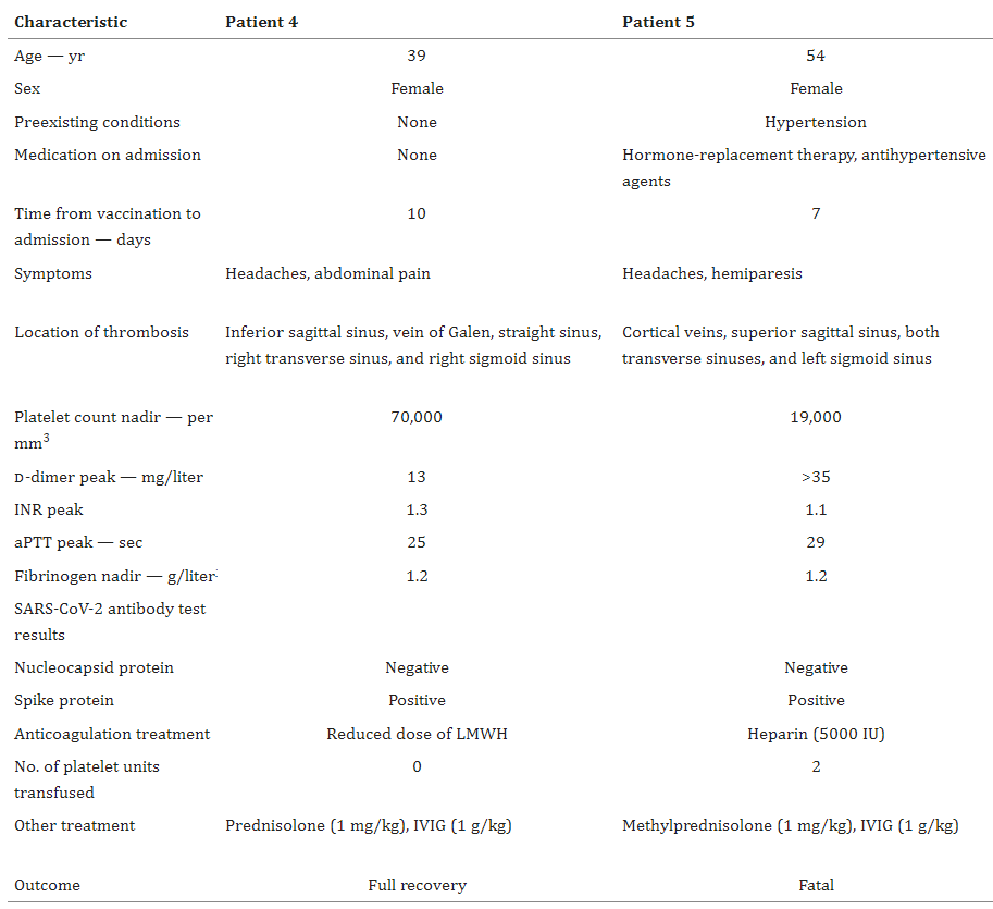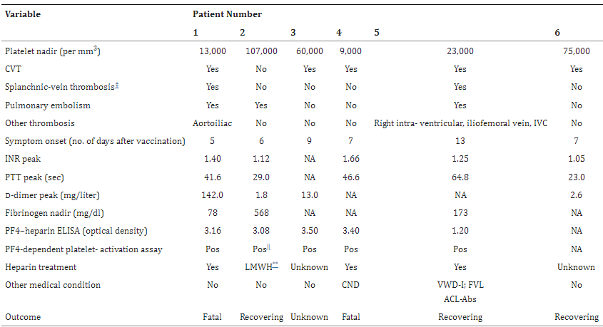 Results: Of the 11 original patients, 9 were women, with a median age of 36 years (range, 22 to 49). Beginning 5 to 16 days after vaccination, the patients presented with one or more thrombotic events, with the exception of 1 patient, who presented with fatal intracranial hemorrhage. Of the patients with one or more thrombotic events, 9 had cerebral venous thrombosis, 3 had splanchnic-vein thrombosis, 3 had pulmonary embolism, and 4 had other thromboses; of these patients, 6 died. Five patients had disseminated intravascular coagulation. None of the patients had received heparin before symptom onset. All 28 patients who tested positive for antibodies against PF4–heparin tested positive on the platelet-activation assay in the presence of PF4 independent of heparin. Platelet activation was inhibited by high levels of heparin, Fc receptor–blocking monoclonal antibody, and immune globulin (10 mg per milliliter). Additional studies with PF4 or PF4–heparin affinity purified antibodies in 2 patients confirmed PF4-dependent platelet activation.