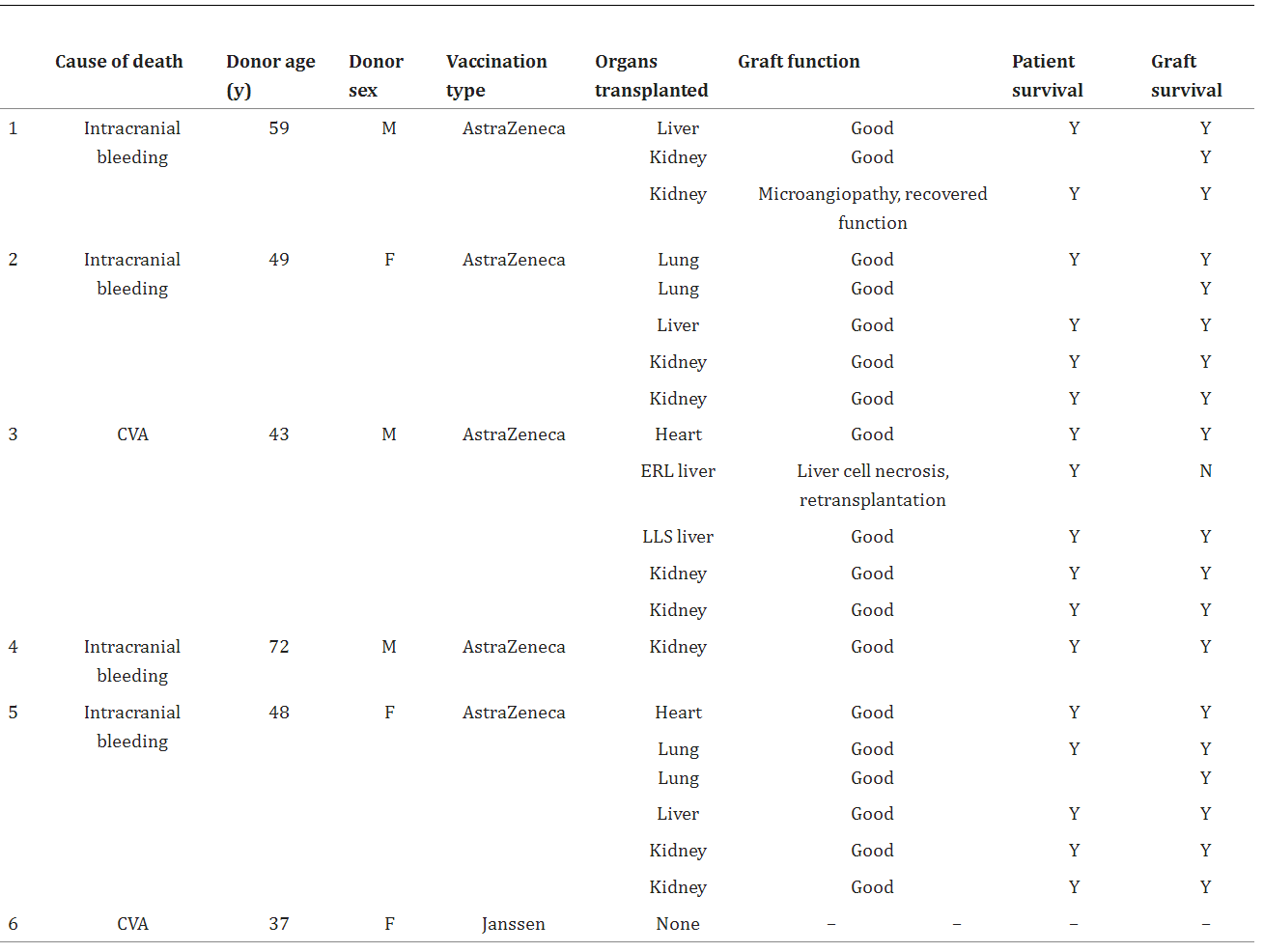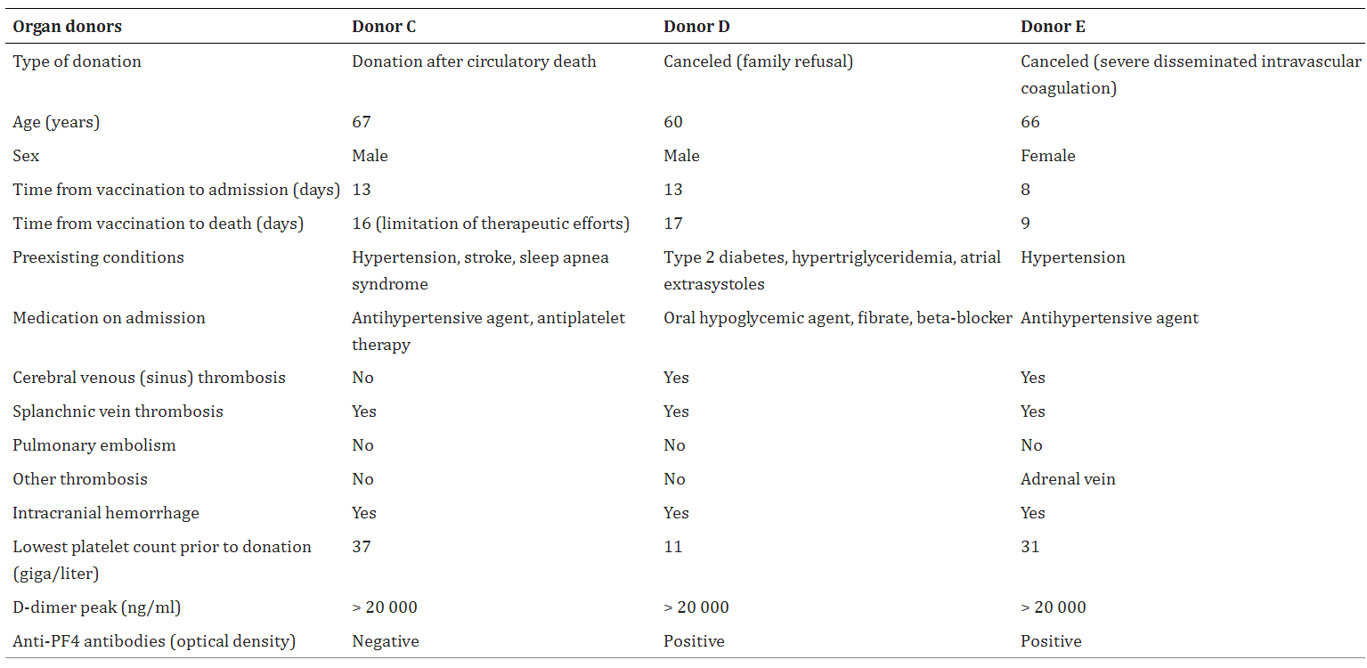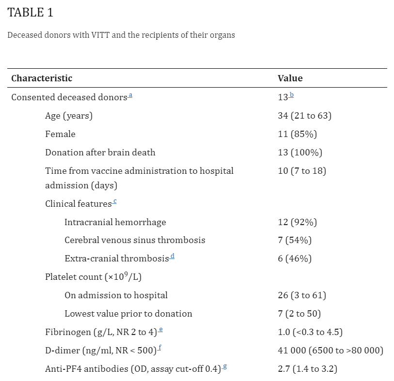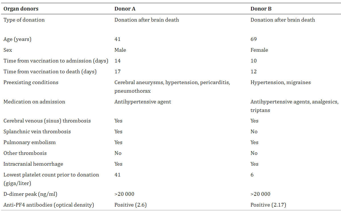 The following are case reports documenting cases where organ transplants from patients killed by VITT caused by a covid vaccine were either performed or at least considered Patient/s listed refers to donor/s killed by vaccine: