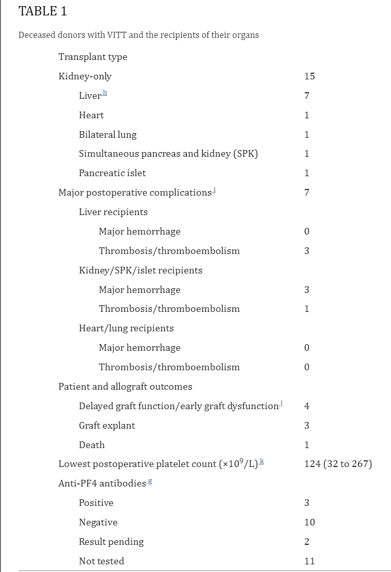 T-VITT #9: Solid organ procurement and transplantation from deceased donors with vaccine-induced thrombosis and thrombocytopenia (Loupy et al)32
