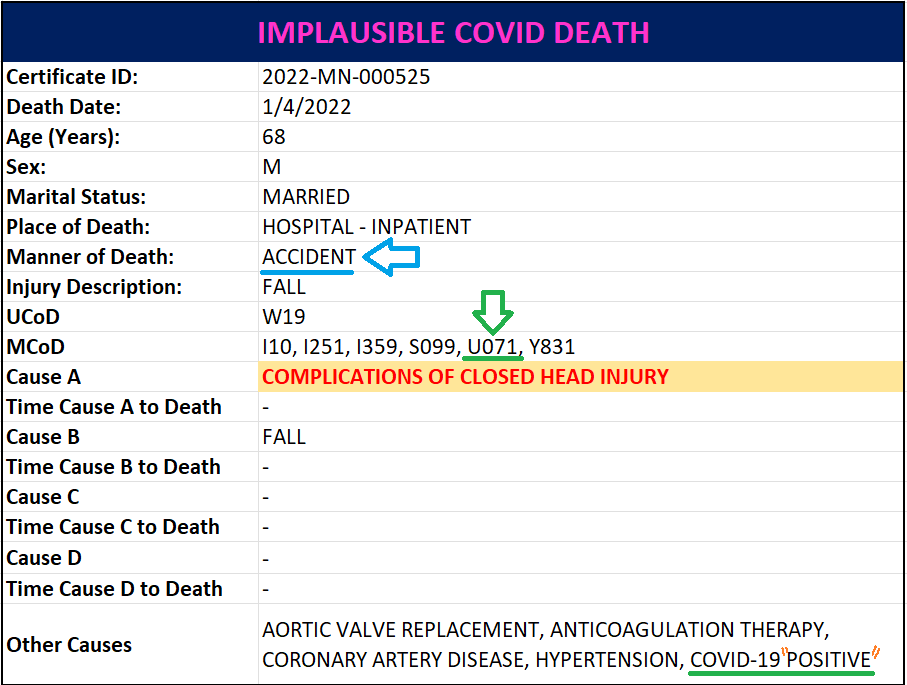 (There are at least two other ICD codes that can be used, T88.8 & Y59.9, which would technically fit for covid vaccine side effects; however, we have not found any death certificates that contained either of these)There were nine death certificates in Minnesota that identified a covid vaccine as a COD, but the CDC applied T88.1 or Y59.0 on only TWO out the nine. **Ergo, the CDC refused to apply a vaccine ICD code for seven of the nine death certificates that identified a covid vaccine as a COD**