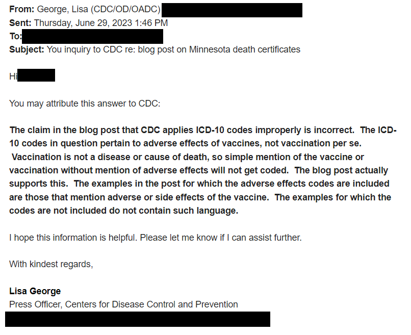 Even if everything the CDC says in their statement is technically correct, the CDC still fails to offer any explanation that justifies omitting ICD codes for COD’s identifying a covid vaccine.