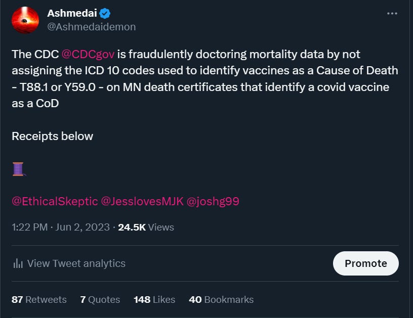There is no material benefit from omitting vaccine injury ICD codes from a handful of death certificates. Even if, as the CDC protests, applying the ICD codes here would be a material misrepresentation of the true clinical causes of the deaths in question, it would still not amount to something that has negative cognizable downstream effects. Because of the extreme scarcity of death certificates documenting a covid vaccine as a COD, anyone performing an analysis or study using these data can easily adjust for these ‘erroneously’ coded COD’s manually with minimal effort. Neither can a unicorn this uncommon adulterate the picture presented by the totality, or even any subset, of these data - there simply exist far too few instances to create the mirage of a systematic phenomenon.