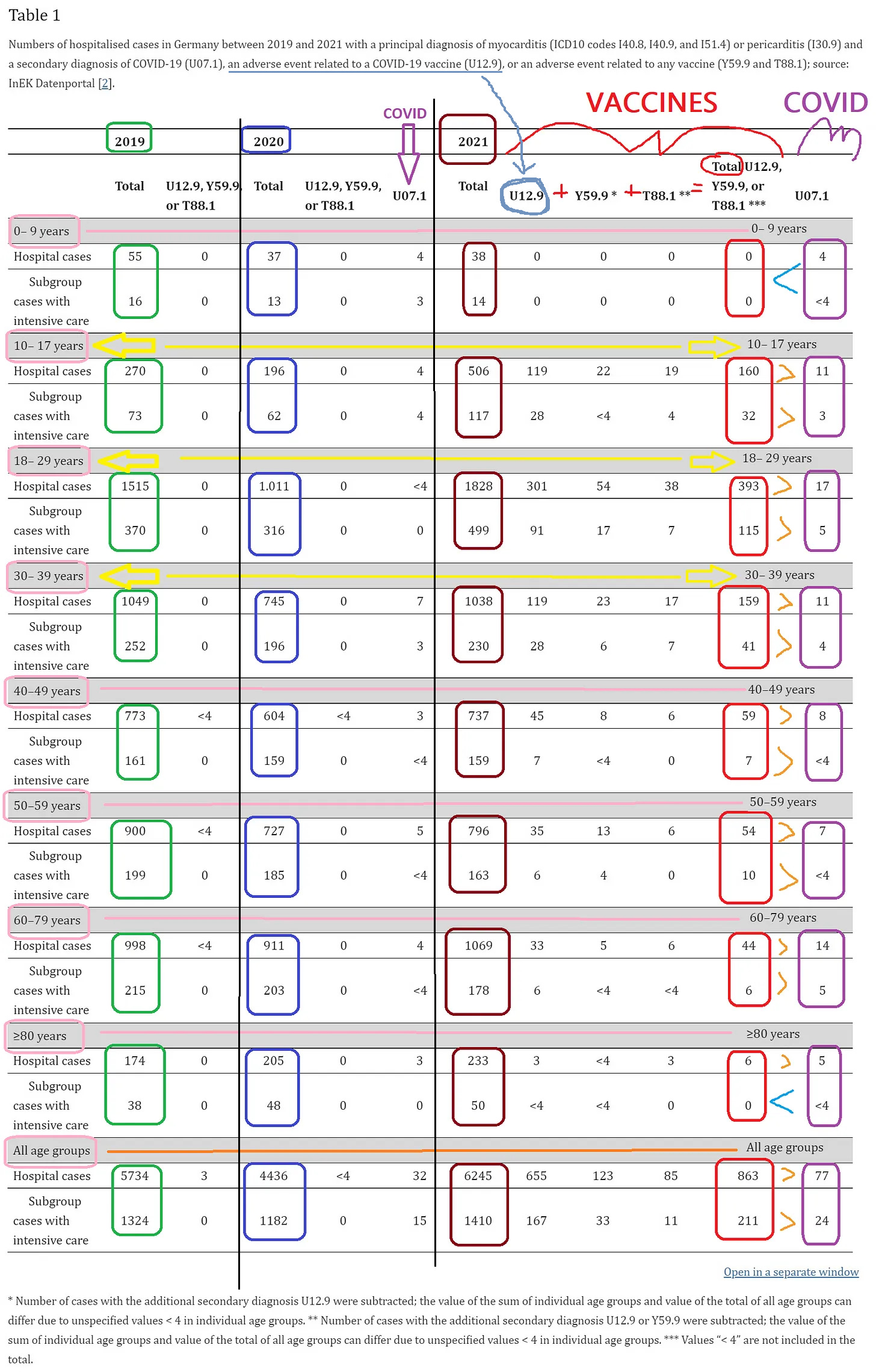 A pair of courageous German researchers using this German hospital data compared the number of cases of myocarditis/pericarditis for the years 2019, 2020 and 2021. They also looked up the number of cases of myo/pericarditis that were diagnosed as either a complication of covid disease, or a vaccine injury. In their own words, they tallied the following: