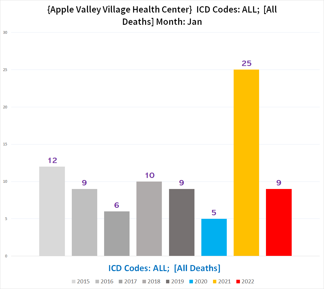 While the numbers from Steve Kirsch’s informant and mine from the death certificate do not match up precisely, this could be due to a few death certificates not identifying Apple Valley Village Health Center as either the decedent’s residential facility or the decedent’s place of death. (Yes, coroners or doctors filling out death certs make lots of errors, a subject for another time.)