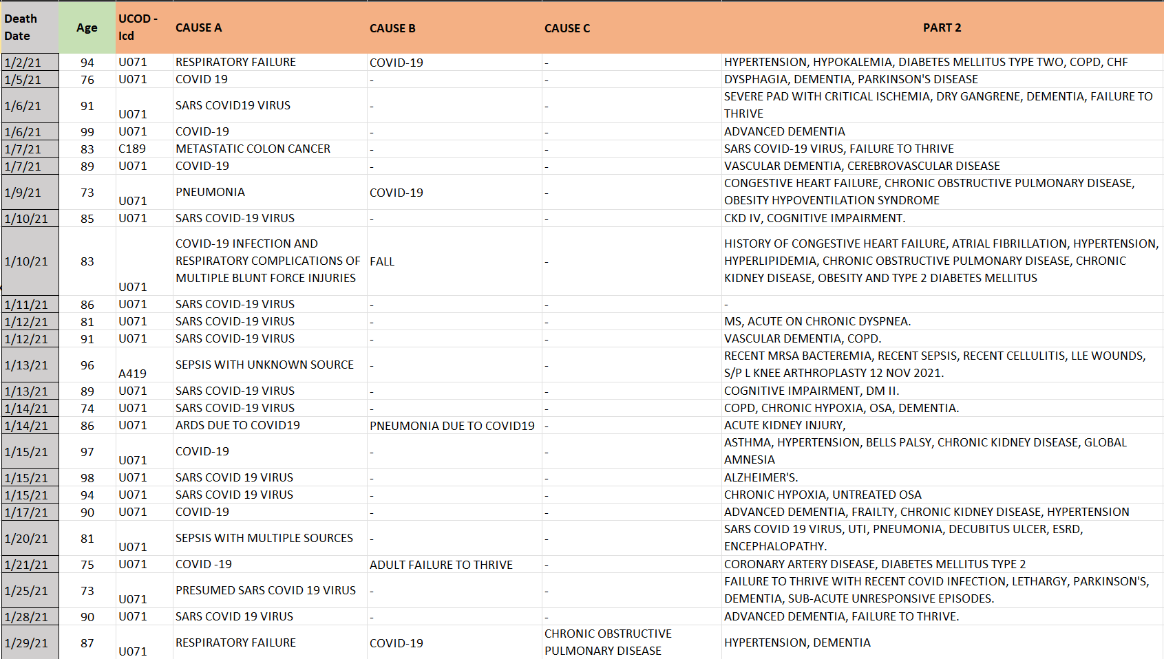 The screenshot below contains all the causes of death and the ICD 10 code assigned as the UCoD on the death certificates for the January deaths from AVVHC. U071 is the code for covid. You can judge for yourself how credible they are: