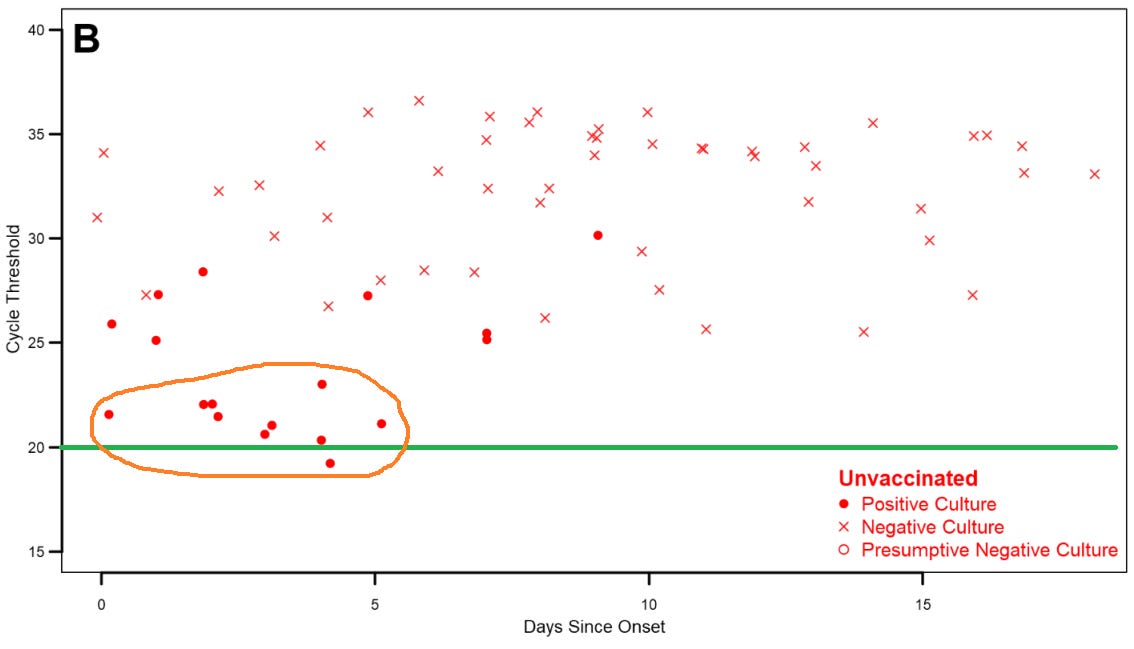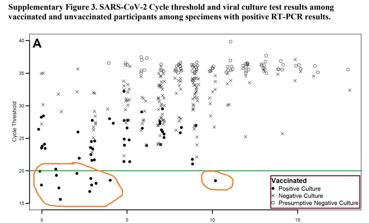 If you count them up, there are almost 100 empty circles in this chart representing the positive PCR tests that were not cultured & were not included in Figure #3A. Almost half of these empty uncolored circles are on the upper left of the vaccinated portion of the chart - meaning they were PCR-positive samples taken in the first few days after symptom onset where the viral load was at its highest.