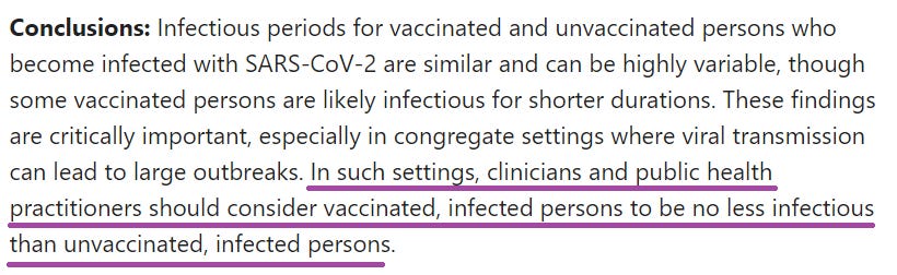 “clinicians and public health practitioners should consider vaccinated, infected persons to be no less infectious than unvaccinated, infected persons.”