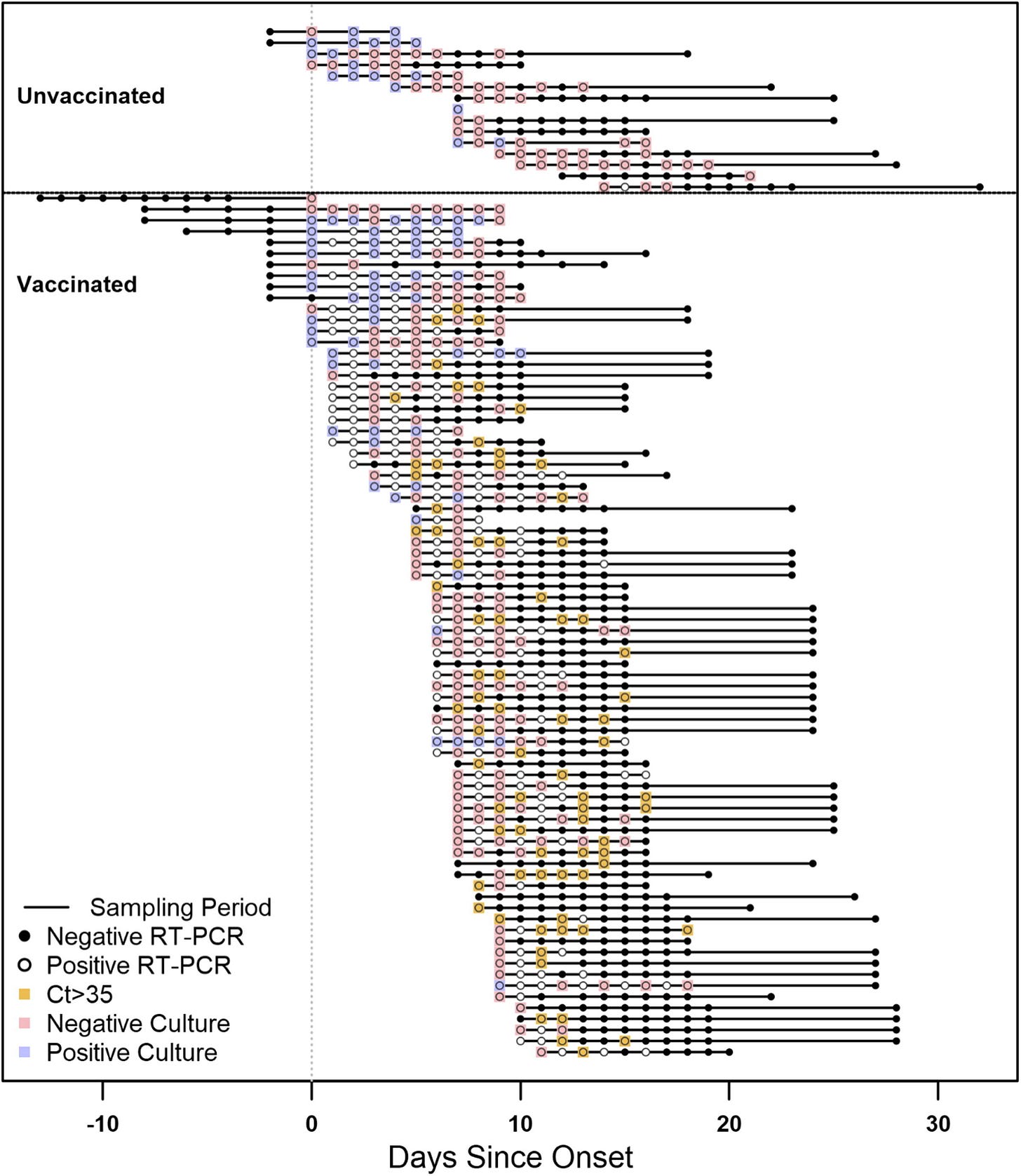 Fig. 1. Timelines and results of nasal mid-turbinate specimens collected from enrolled participants, Federal prison, Texas, July 12—August 9, 2021. The timelines of specimen collection and laboratory results for 95 included participants are represented diagrammatically, indexed by the day of onset. Onset was determined to be either a) date of first onset of self-reported symptom(s) meeting the case definition of COVID-19 or b) date of first positive diagnostic SARS-CoV-2 test, whichever occurred first. Each participant is represented by a horizontal line corresponding to the investigation sampling period during their time-course of illness. Participants who were unvaccinated (including 2 participants who received only the first dose of a two-dose COVID-19 vaccine series) are depicted at the top of the figure, while vaccinated participants are depicted at the bottom. RT-PCR results are represented by solid circles (positive results) or open circles (negative results). For specimens with positive RT-PCR results for which viral culture was performed, culture results are indicated by overlaid blue boxes (positive culture results) or red boxes (negative culture results). Specimens with positive RT-PCR results with a cycle threshold (Ct) value>35 for which viral culture was not performed are indicated by overlaid orange boxes (indicated a presumptive negative viral culture result). Some participants provided specimens during case-finding testing while in quarantine and may have RT-PCR negative specimens collected prior to onset.