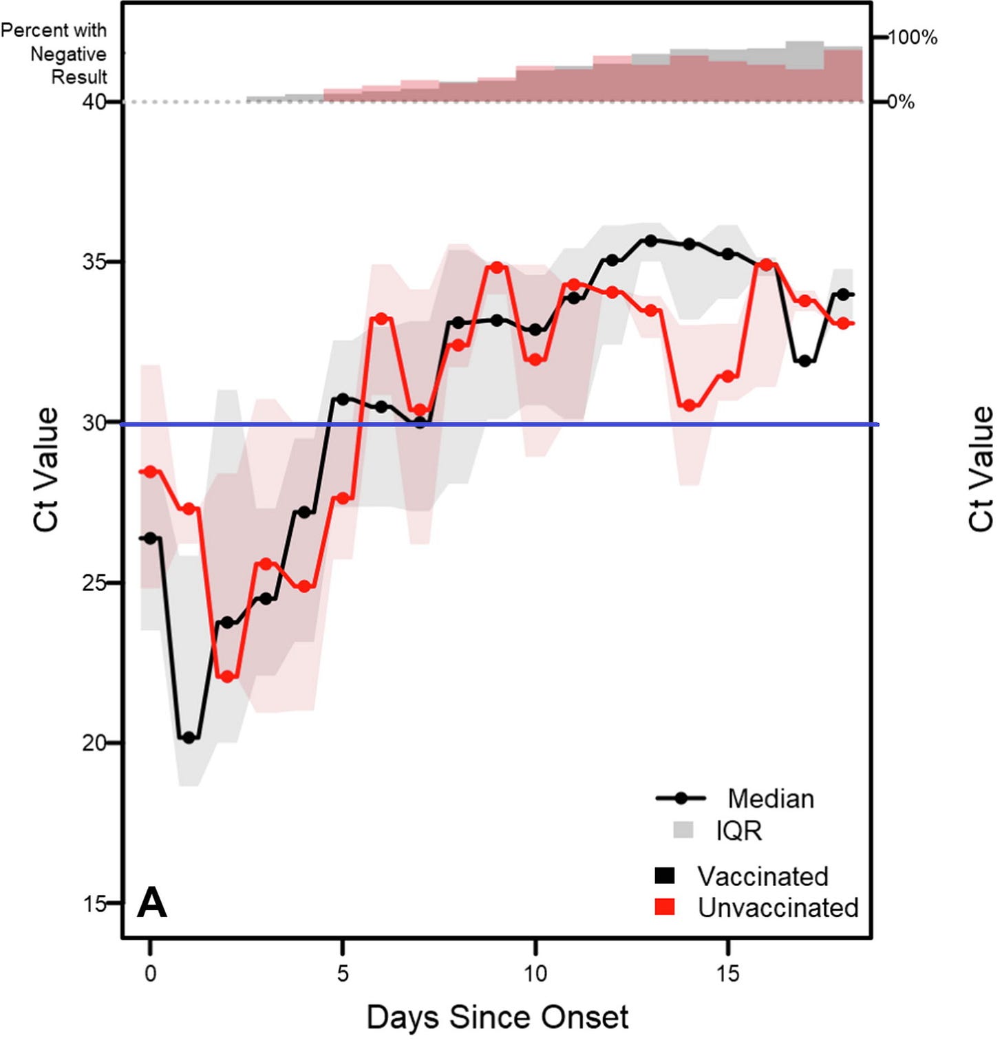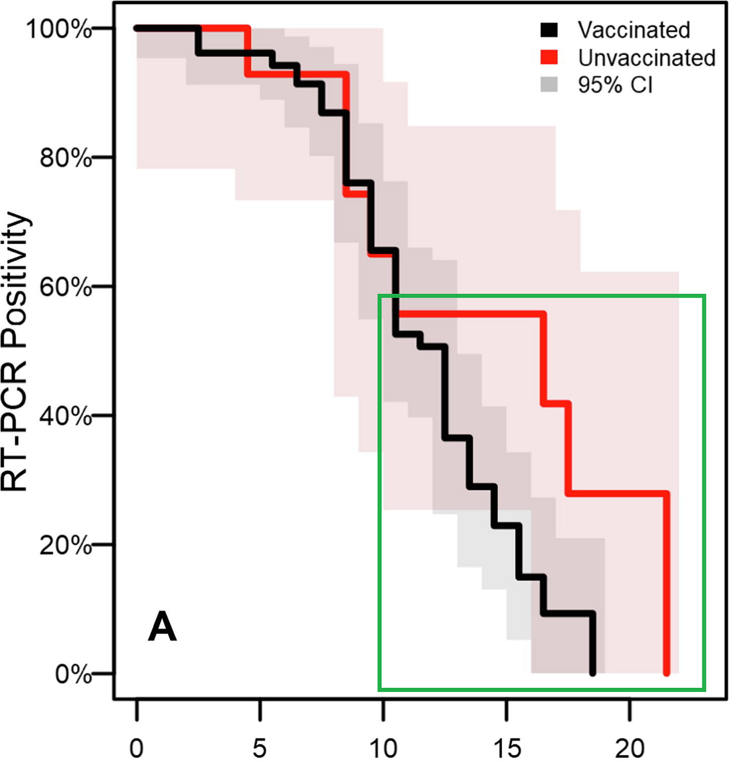 This is the most deceptive chart in the study visualizing the false establishment narrative - it offers a visually compelling but deceptive notion that the unvaccinated were “infected” for longer than the vaccinated were. As we shall see, the positive tests in the unvaccinated after 10 days were practically all negative when cultured - meaning that these positives were nothing more than bits of dead virus.