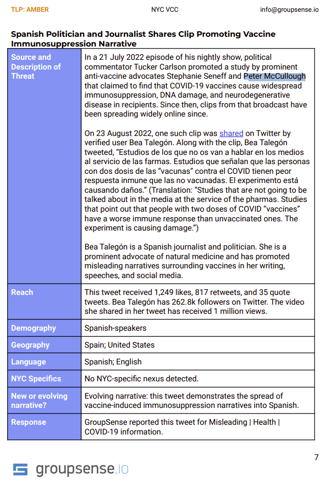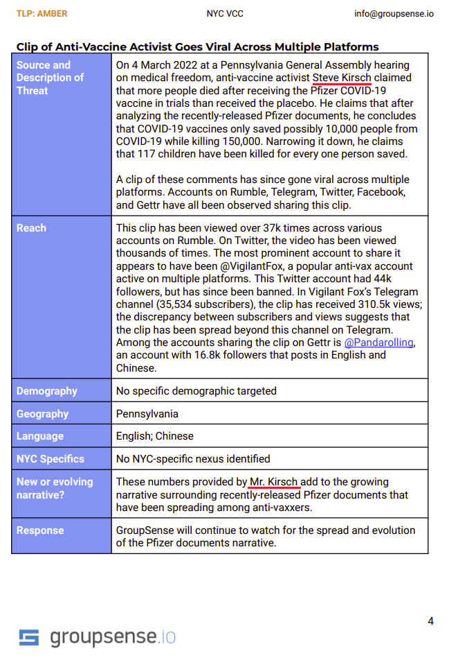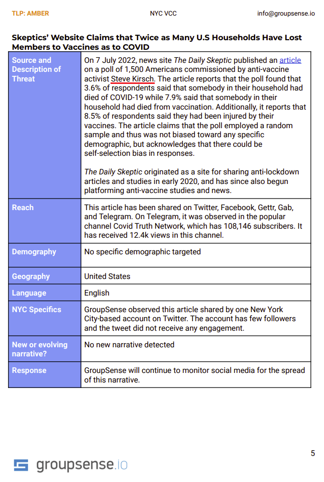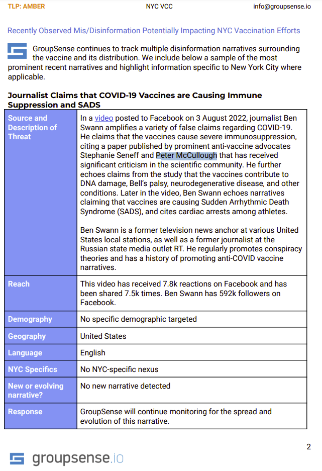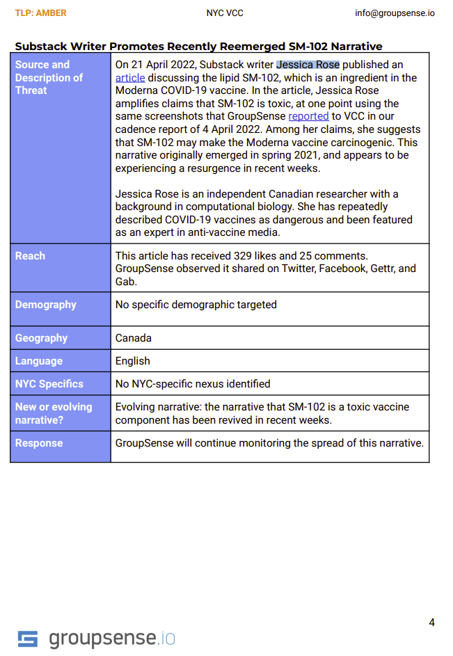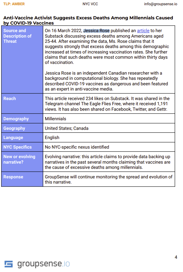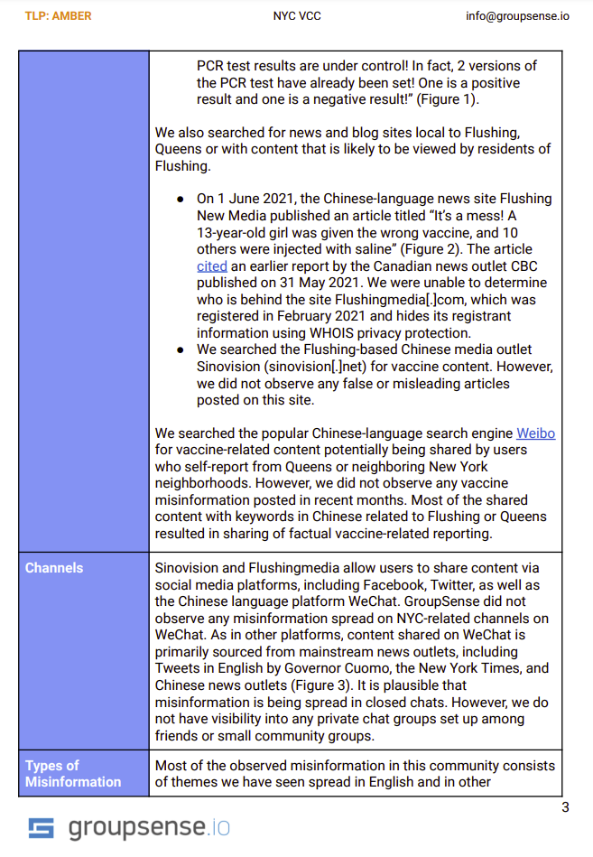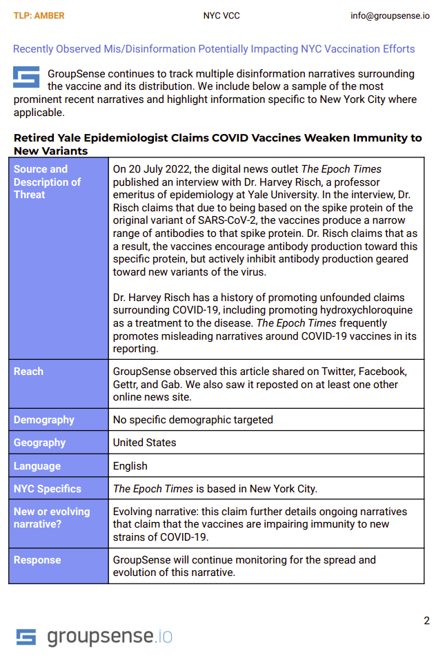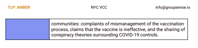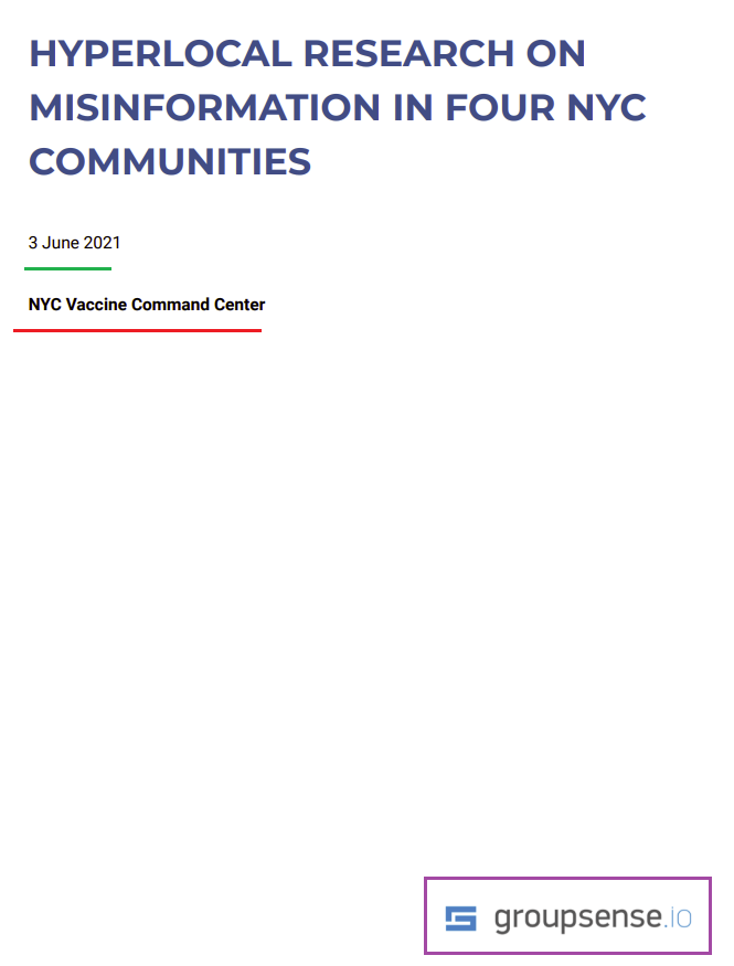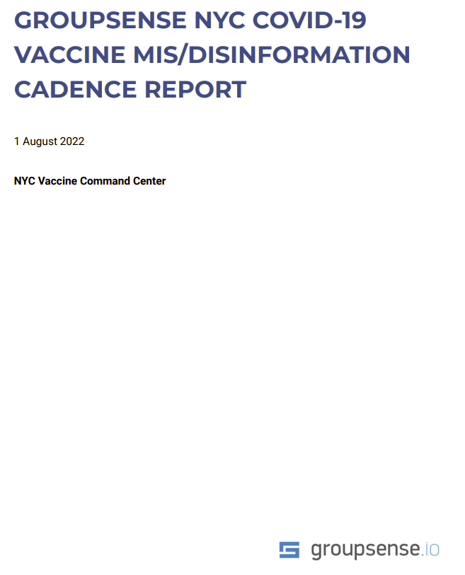 -FOIA’d a bunch of documents out of the NYC Department of Health, including the following: (PDF copy below)Long story short, it turns out that NYC contracted a third party to monitor social media in NYC to track “mis/disinformation” about covid-related issues, titled “Hyperlocal Research on Misinformation in Four NYC Communities”. These reports seem to have been commissioned for the “NYC Vaccine Command Center”.