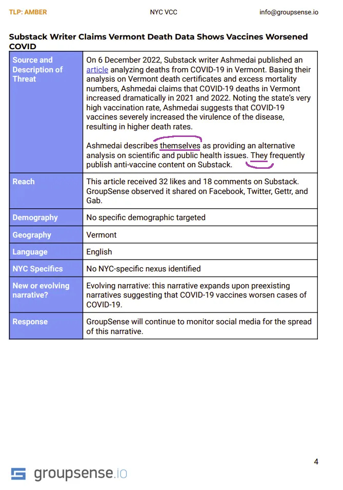 After almost two years on substack, I have finally received the ultimate vindication: The coveted honor of being identified by a government censorship operation of spreading “misinformation”, in this instance curtesy of NYC’s “Vaccine Command Center”. They even misgendered me as “they / them”.1 Oh the HORROR!! (purple underlined below)