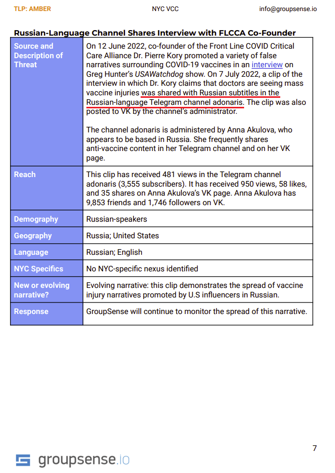 The irony that the one time Dr Kory is singled out is in connection with the Russians is simply too delicious to not point out here (even though it makes sense because they’re looking at the Russian community):