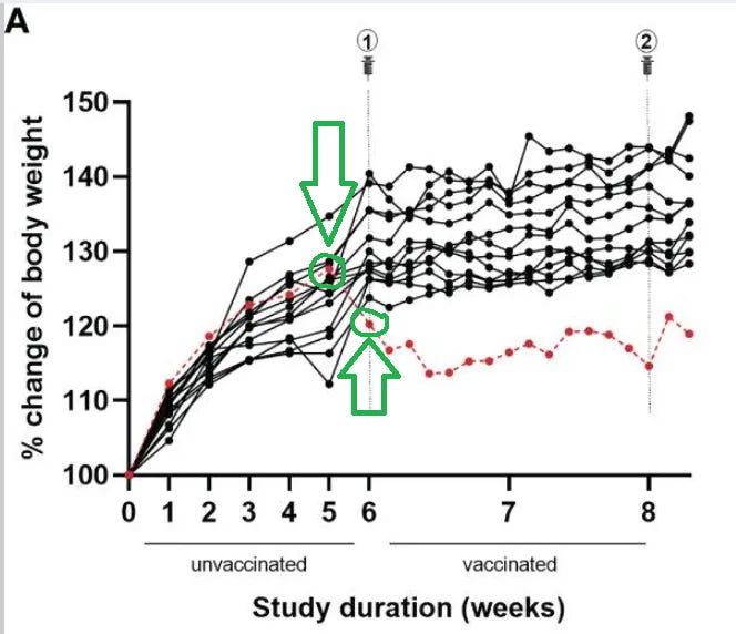 If we look at Figure 4A, we see that the cancer mouse had a drop off in the % increase of its body weight in the week preceding vaccination, while every other mouse experienced an increase in the % increase of body weight over that same week (circled in green):