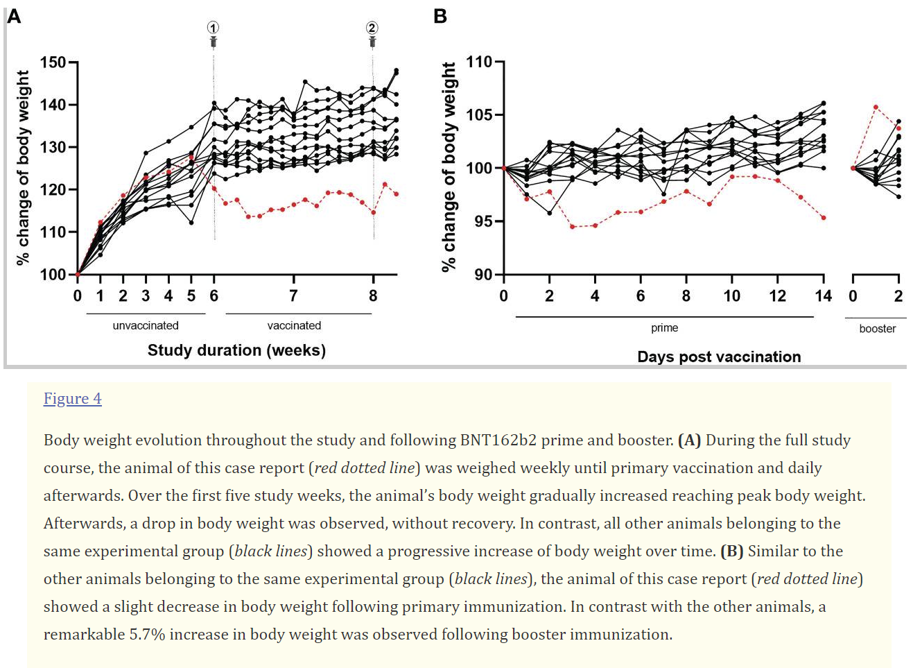 Second, with each immunization, the animal received a disproportionately larger dose of BNT162b2 per gram of body weight than would be the case in human use (i.e., a normal dose contains 30 µg BNT162b2 mRNA). Correspondingly, a much greater SARS-CoV-2 mRNA vaccine-specific immune response may have been elicited by each of the two BNT162b2 mRNA vaccinations.