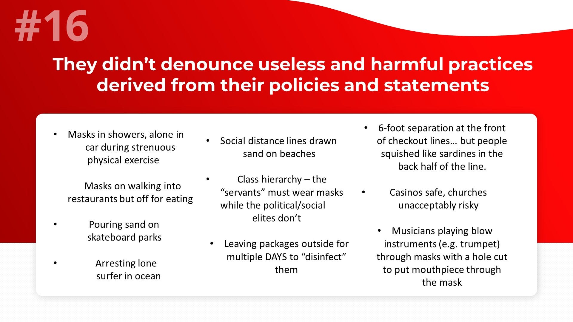 Not only did they not protest the cray-cray, but often public health officials openly pushed delusional or incoherent “advice”.