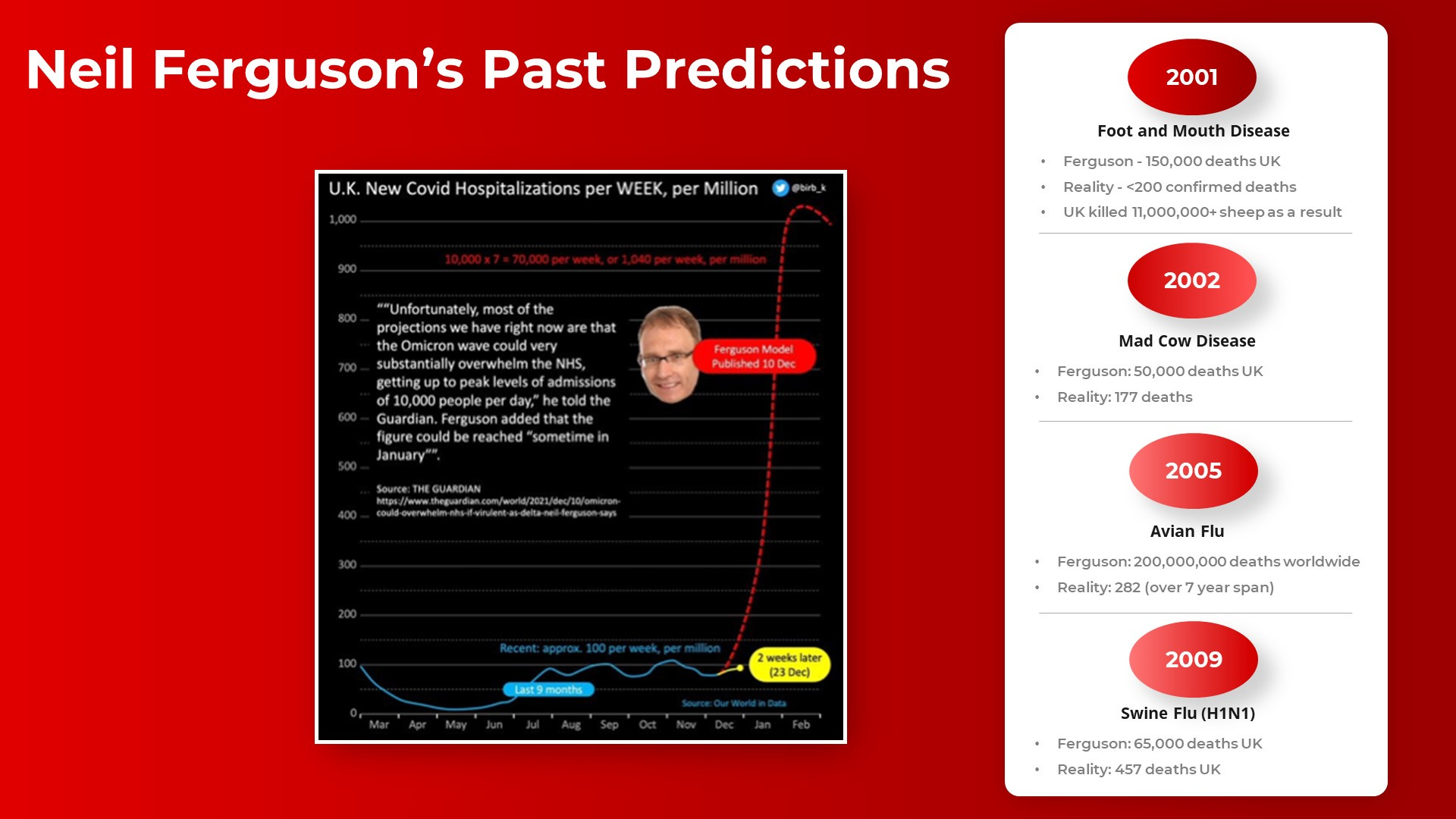 The most egregious example is his prediction that an avian flu would kill 200M (!!) ppl, but over a 7-year span there were only a trifling 282 deaths.