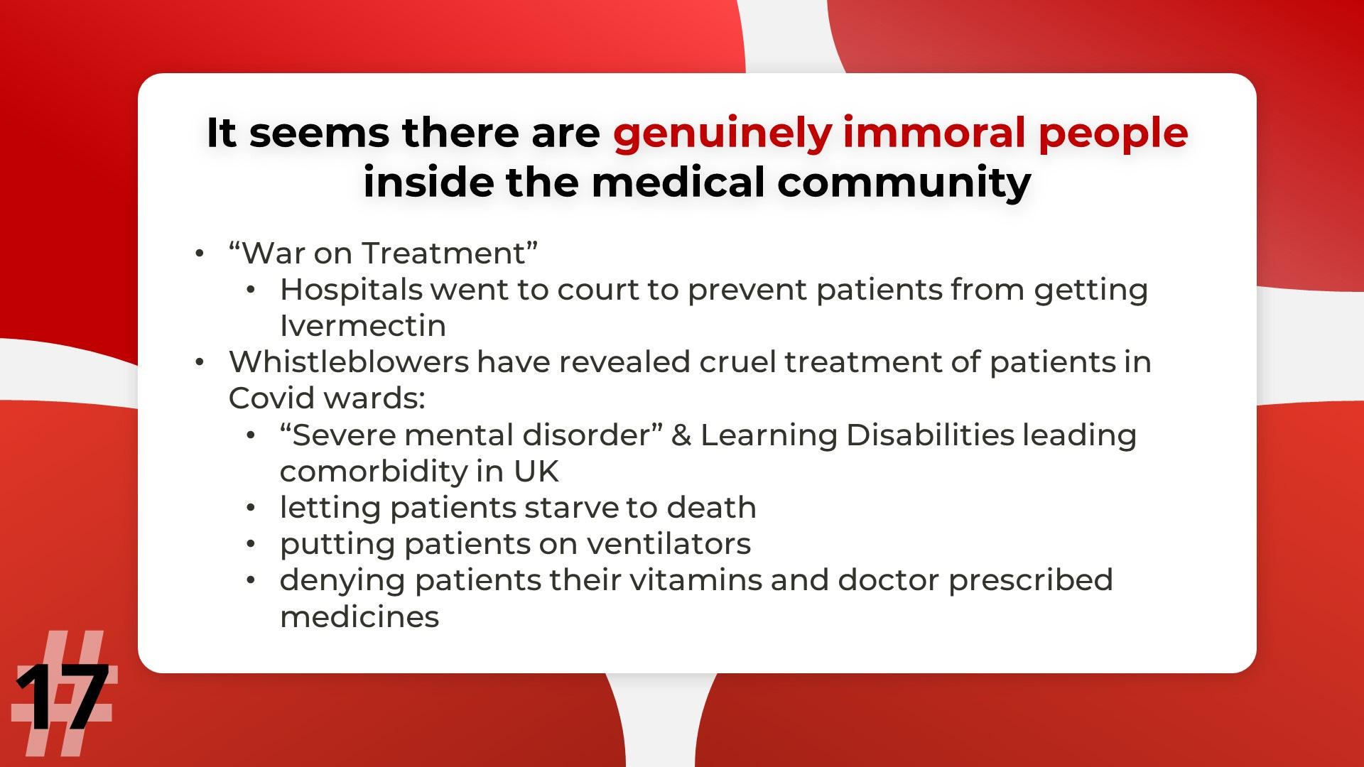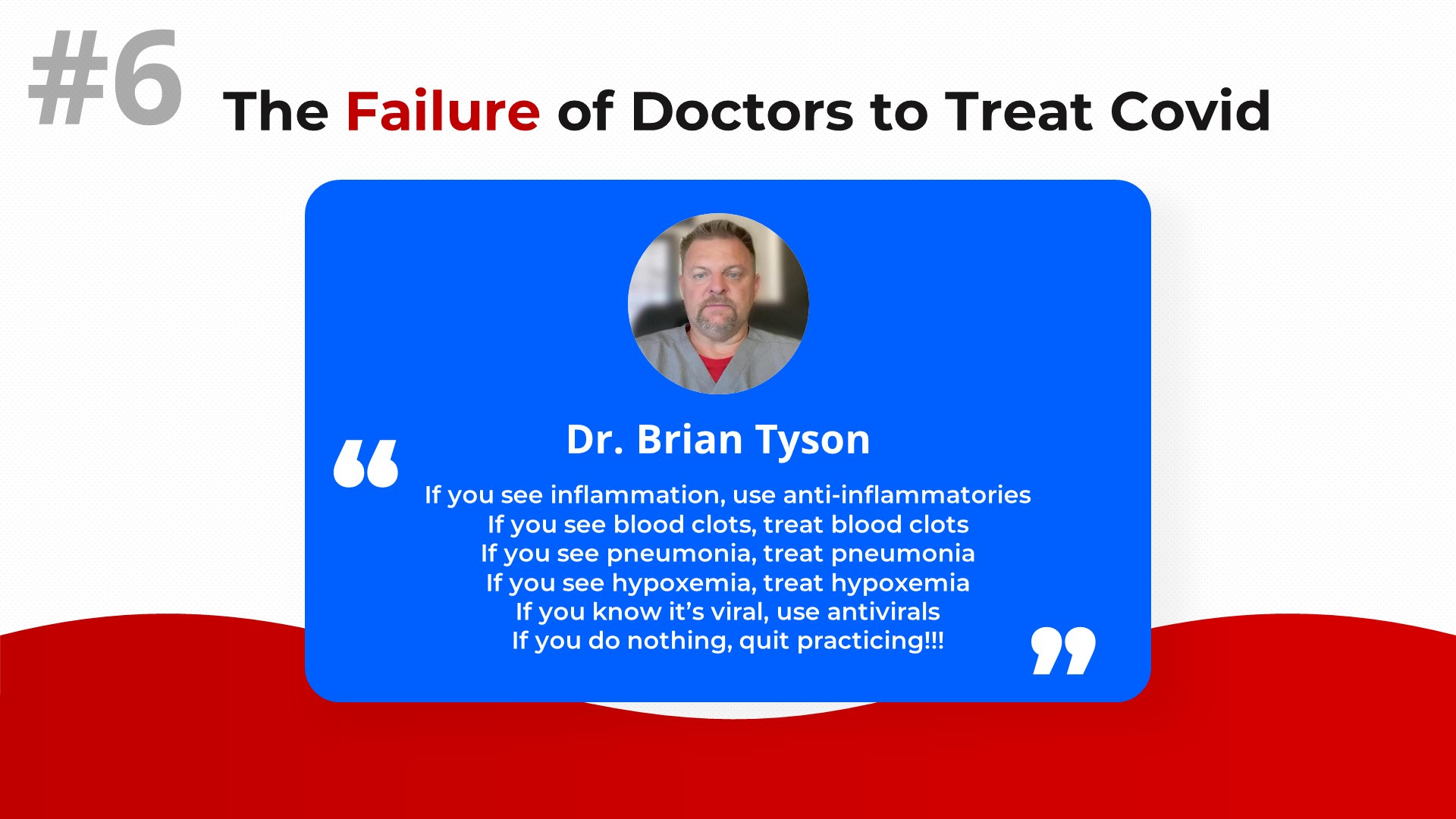 Ethical failure: Dr. McCullough has referred a number of times to one of the foundational ethos of medicine - when a patient seeks treatment from a doctor, the doctor has an ethical duty to either treat the patient or refer the patient to another doctor who will. There is no option “Good luck, I hope it turns out ok” - or in other words, “go home until you can’t breathe then go to the ER & hope for the best”.