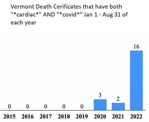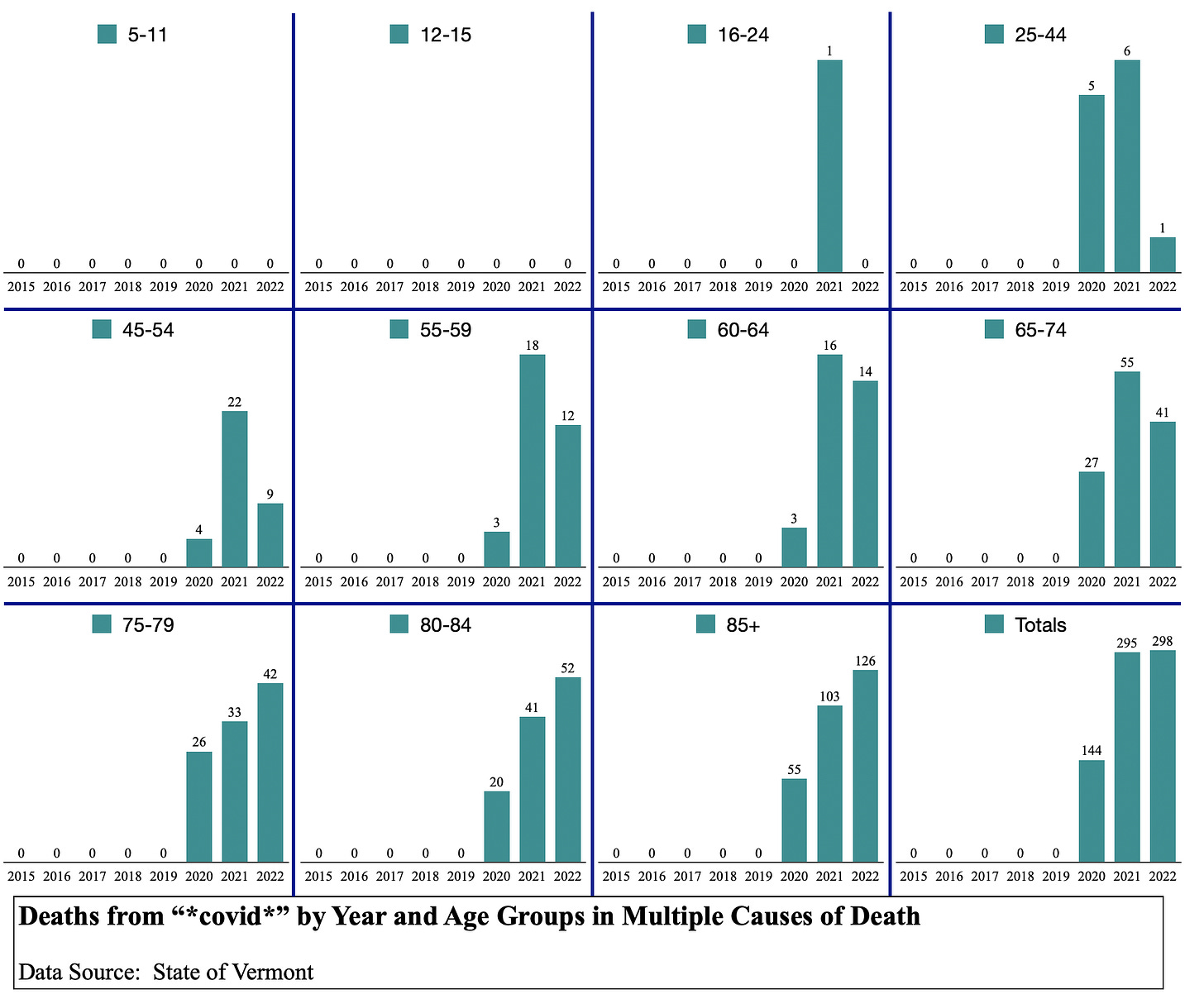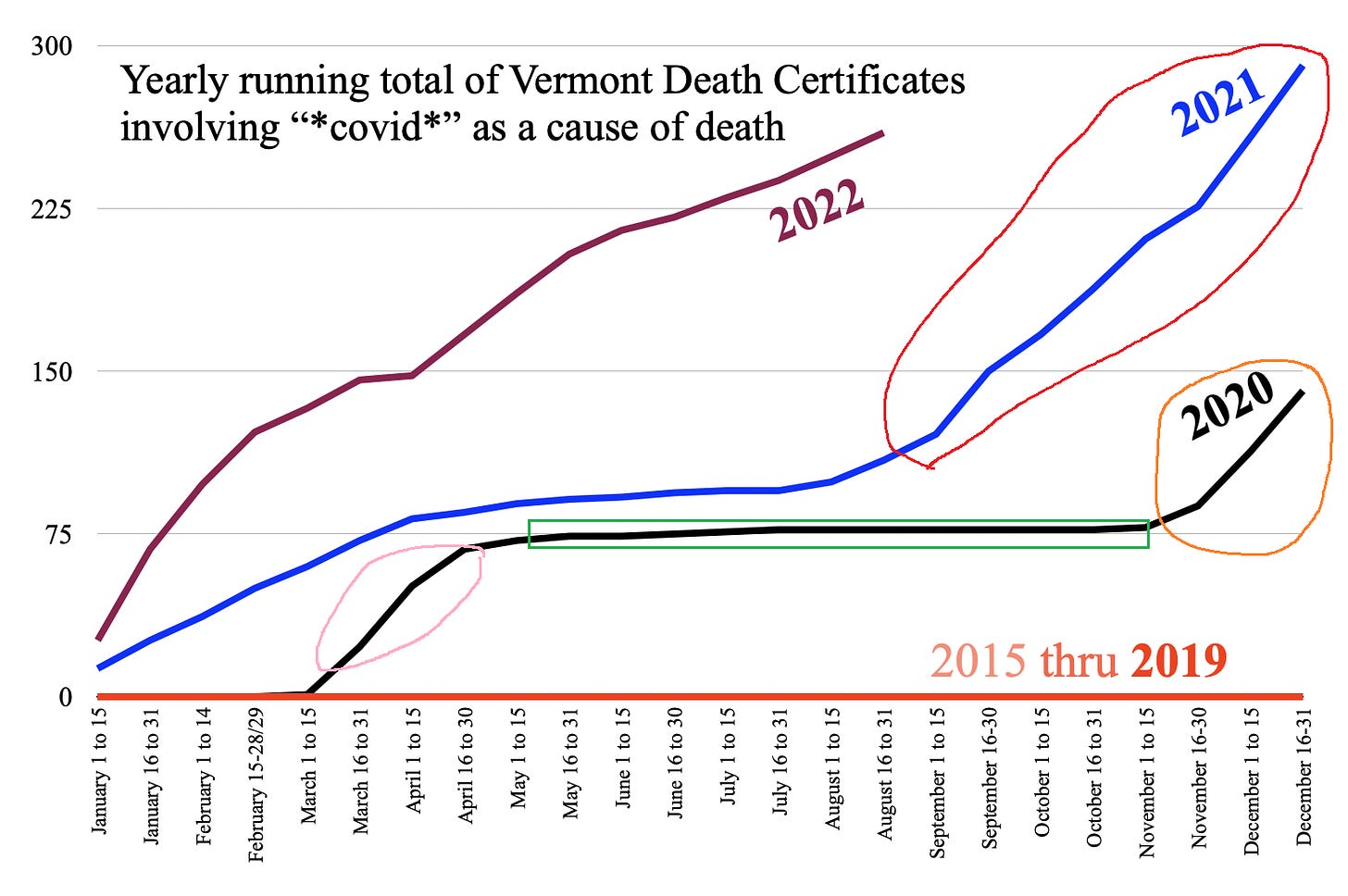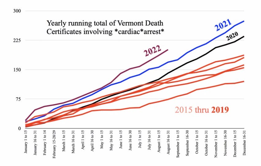I obtained from the state of Vermont the death certificates for all deaths that occurred in the state for the years 2015-2022 (through 10/26). Although we are just beginning to sift through the data, we have some preliminary deeply concerning observations that are inconsistent with claims of both vaccine safety and efficacy.