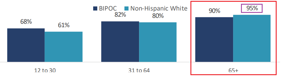 Vermont is probably the most heavily vaccinated state in the US. Vermont achieved 95% vaccination in non “BIPOC” seniors 65+ by September 2021 (the population of Vermont is 93.6% White according to Google).