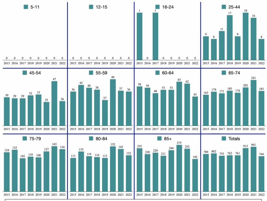 Note: The total for each year is larger than the sum of all age groups, because there are a handful of deaths every year where the specific date of death is unknown which are listed as a date of 99/99 (month/day), and aren’t’ included in the disaggregated data charts that used specific dates as one of the attributes to sort the data.