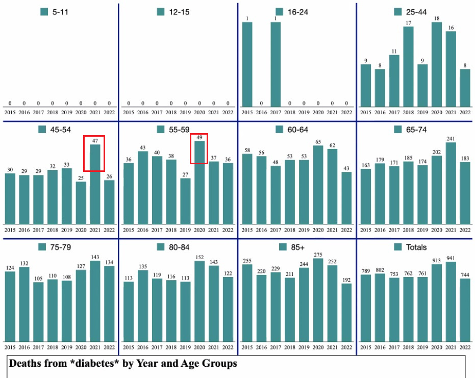 The diabetes deaths in 2020 were not similarly distributed amongst the various age groups in 2021 or 2022. The diabetes deaths are highest in 2020 compared to all other years in people 25-44, 60-64, 80-84, and insanely high specifically in the age group of 55-59yos.