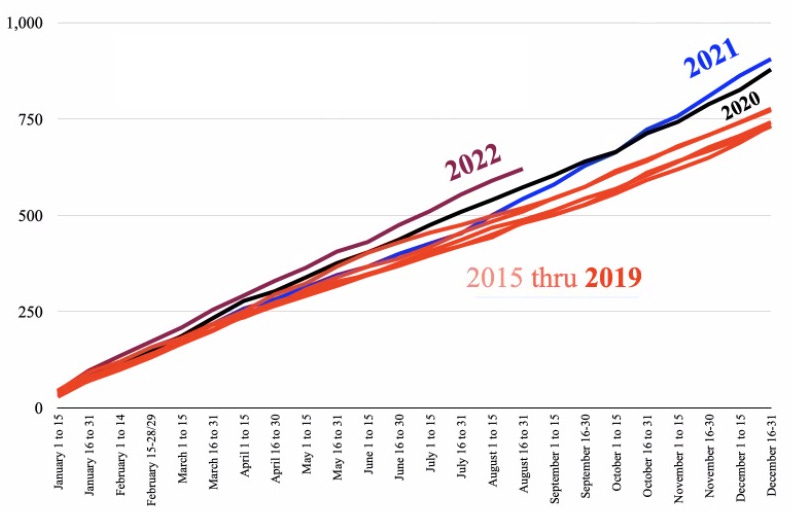 As you can see, 2020 barely breaks above the prior 5 years, even by the end of the year, but 2021 is far and away elevated beyond any other year, and 2022 while tracking higher than 2020 is barely in excess territory (although it could well be that 2022 is much more excess than appears here, because there should have been a sharp deficit following the morbidly obese 2021 excess).