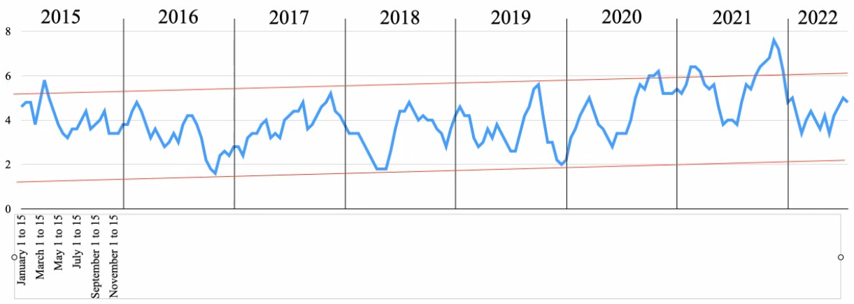 When you look at the week by week trends, 2021 sticks out as a massive outlier: